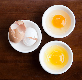 Above is a photo of two eggs one is farm fresh (top) and the other (bottom) is a conventional store bought egg. The yolk of the farm fresh egg is much thicker and darker in color in comparison to the store bought egg and the fresh egg white is much clearer too. The color and consistency of the yolk and egg white are primarily due to the chicken’s diet and nutritian obtained from fresh pasture.